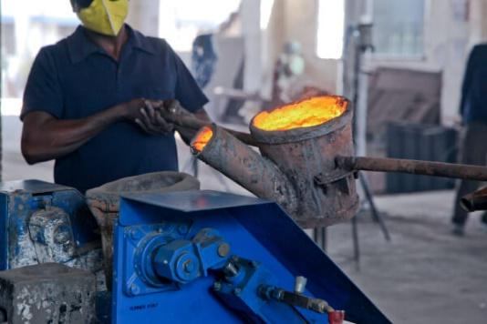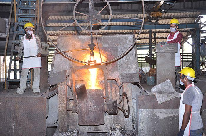 Raw material is classified based on its chemical composition and stored in individual bins, raw material is transferred from the bins to the furnace Manually. Induction furnaces are used to melt the metal, once the required temperature is obtained a chill sample is prepared and the chemical analysis is checked on a spectrometer.